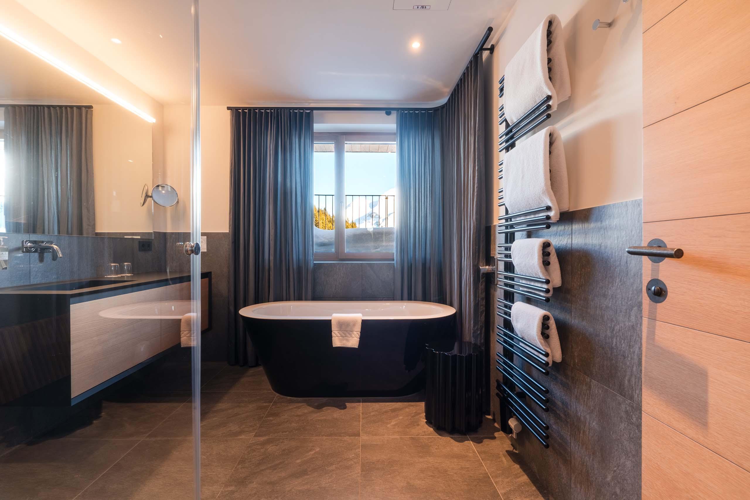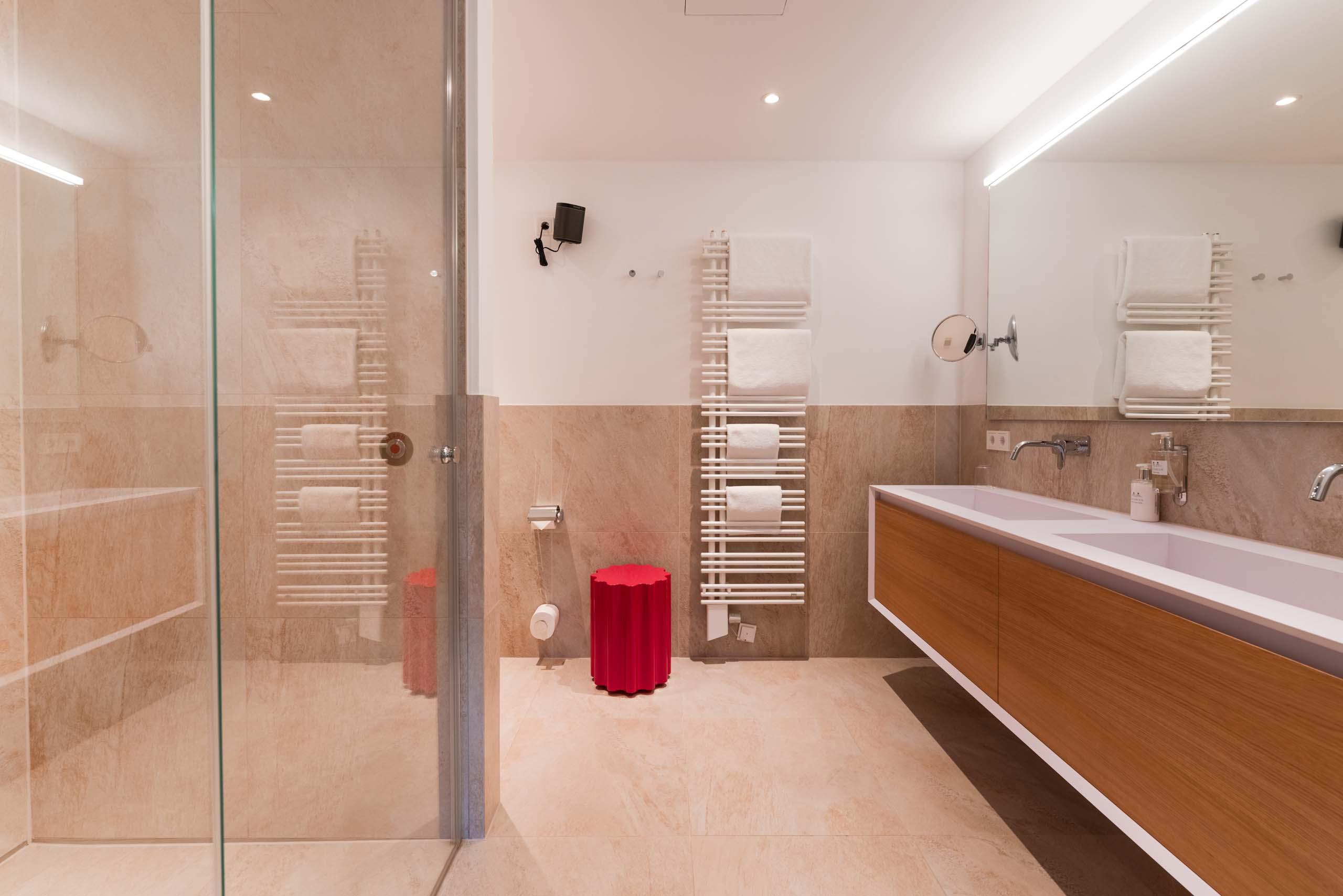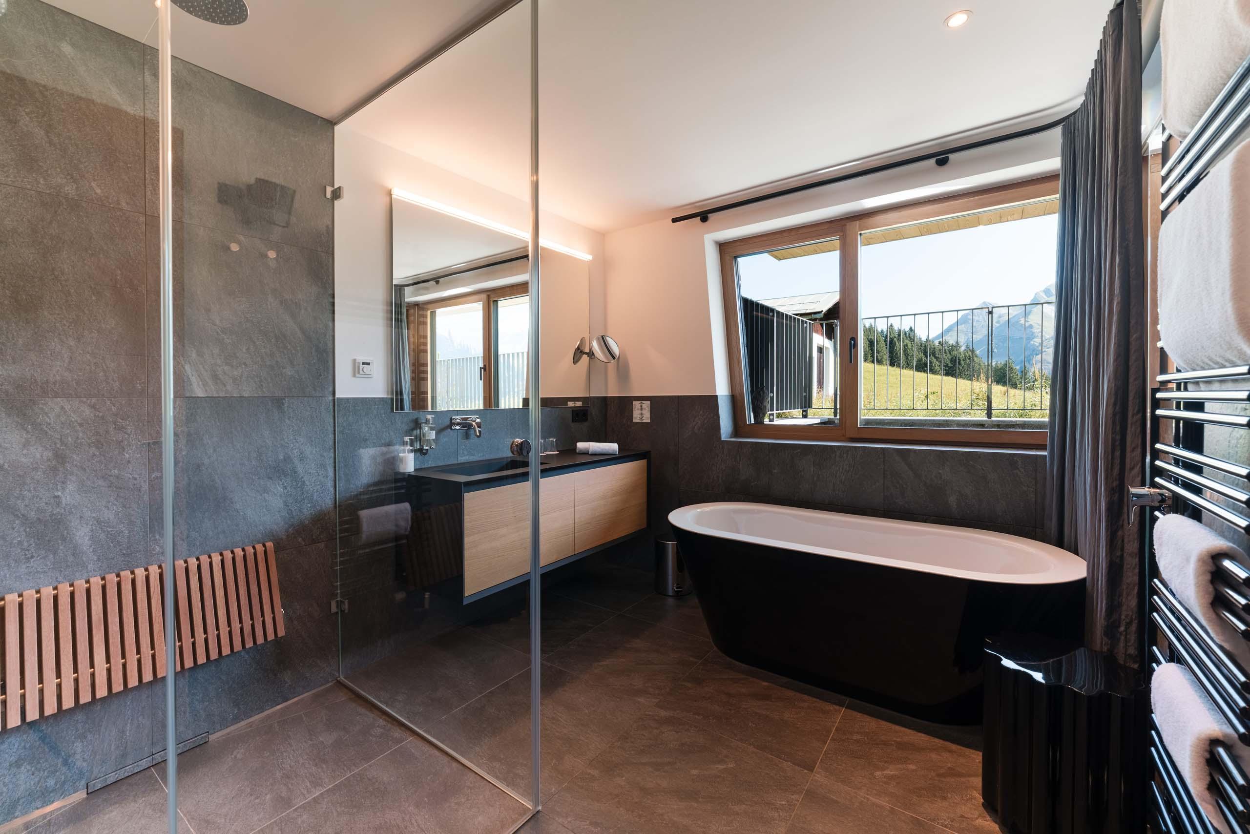 - Ein Badezimmer mit Dampfdusche, Badewanne und WC; ein separates WC