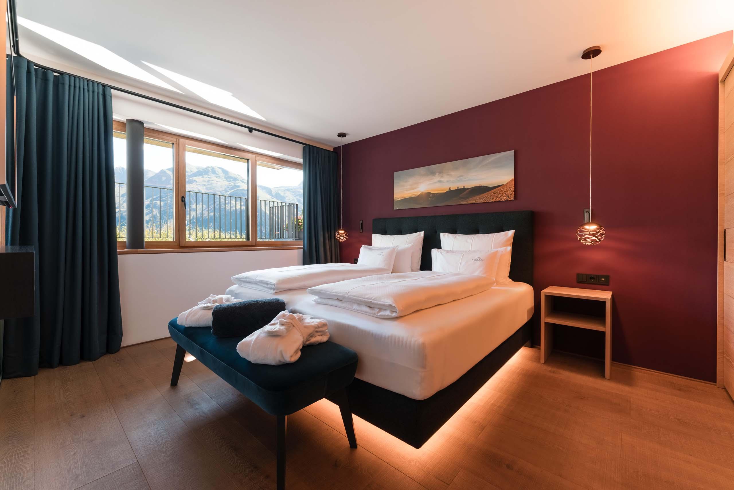 - Ein King‑Size‑Schlafzimmer mit Panorama-Fenster und ein Schlafsofa im Wohnzimmer